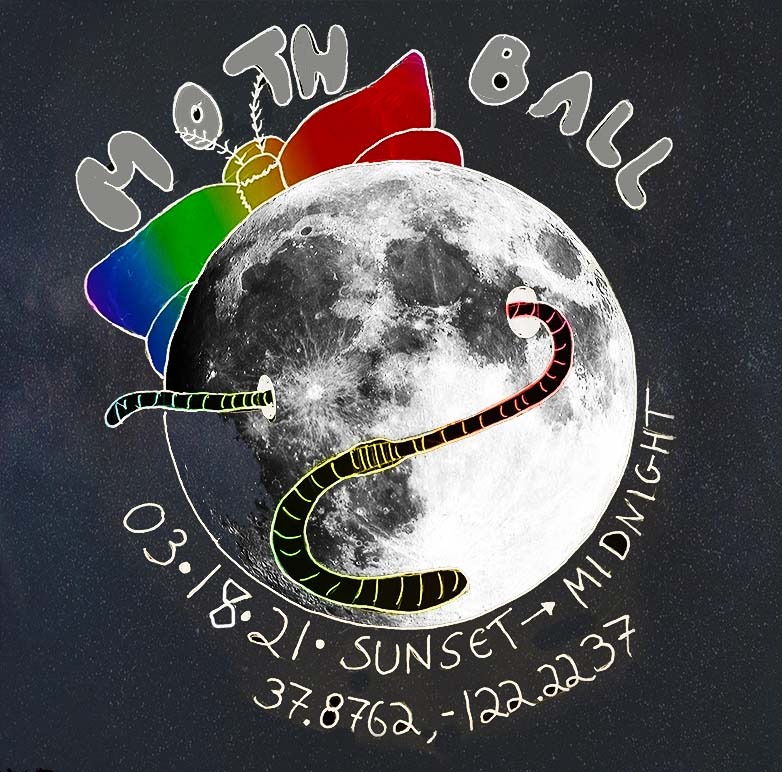 Moths and butterflies share the same scientific family Lepidoptera. But whereas butterflies occupy the popular imagination (around 20,000 butterfly species are currently known to exist), over 180,000 species of moths have been identified. Part of the reason for this is that most moths are nocturnal. Inspired to raise awareness of this overlooked insect and to loosen the anthropocentric imagination, we organise human-moth gatherings in the East Bay hills every full moon. We invite an entomologist to set up moth viewing stations. We build lights from local bamboo and cover-crop fabric. The UV bulbs we use attract moths. We invite our friends.